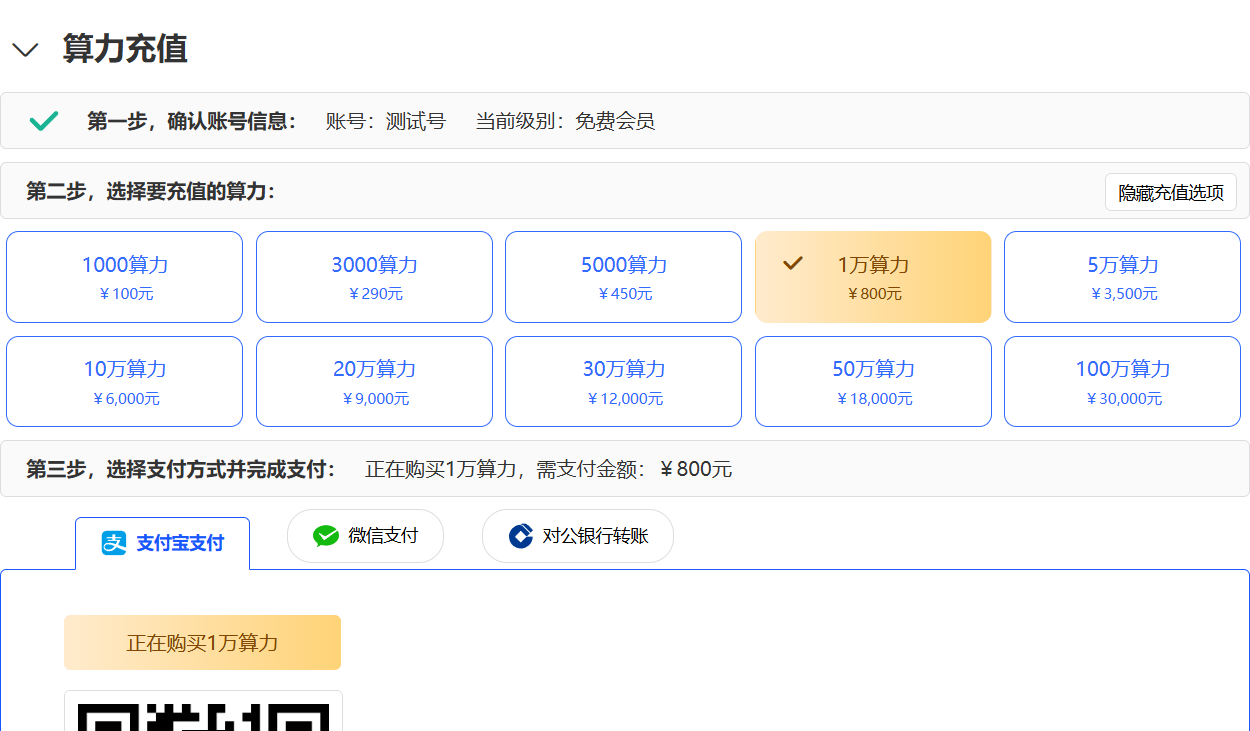 用户登录后,在任意页面顶端点击【充值算力/充值】,即可打开充值算力窗口,可用支付宝、微信、对公转账完成支付。