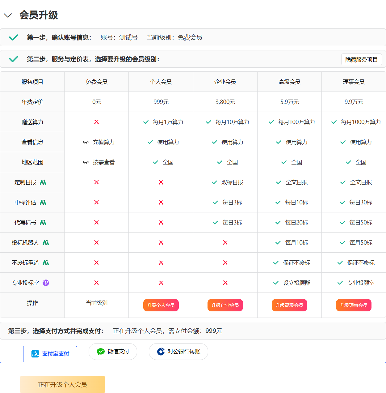 用户登录后,在任意页面顶端点击【升级会员】,即可打开升级会员窗口,可用支付宝、微信、对公转账完成支付。